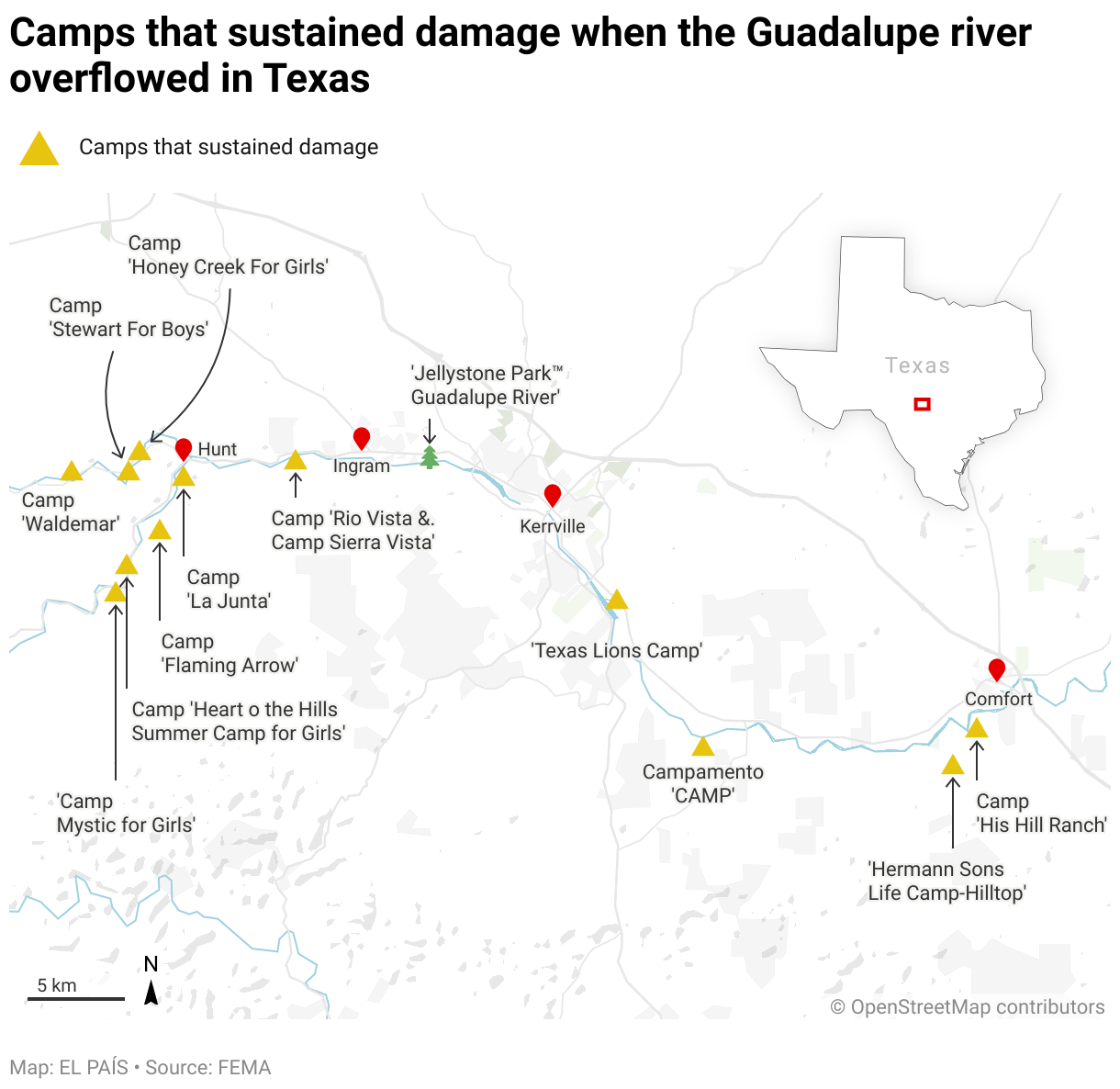 In the area’s main town, Kerrville, City Manager Dalton Rice assured that protocols were being followed, although he has promised a review of what happened. He also offered a simpler explanation: “Unfortunately the rain hit at an inopportune time and right at the most importune areas, where the north and south forks of the river converge.” This is precisely the case at Camp Mystic, where 750 girls were housed. The camp is located in a low-lying area at risk of flooding, next to the South Fork of the Guadalupe River and a creek that feeds it. So far, 27 deaths have been confirmed at the summer camp, including both campers and staff.