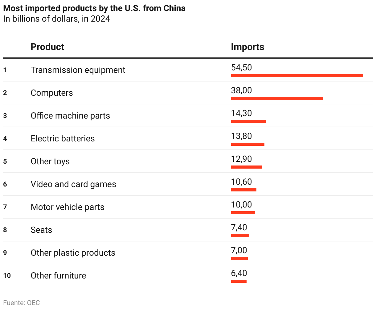 The United States relies heavily on Chinese manufacturing to meet its domestic demand for consumer goods and technology. Among the main products imported from China are telephones, computers, semiconductors, furniture, toys, and textiles. Electronics and machinery alone accounted for more than 50% of the total value of imports, according to foreign trade data.