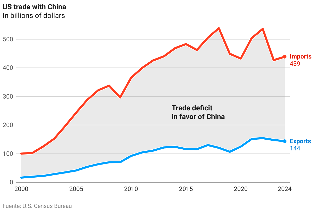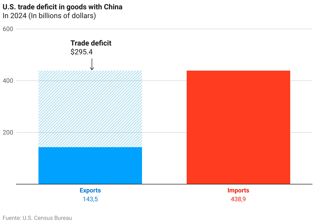 This move effectively shuts off access to the U.S. market for one of its largest suppliers of goods, with which in 2024 it recorded the largest trade deficit — the difference between what a country exports to its trading partners and what it imports — according to data from the U.S. Census Bureau. The trade imbalance reached nearly $300 billion last year, marking a nearly 6% increase from 2023 and consolidating Beijing as the primary contributor to the U.S. trade deficit. This is the thorn in the side of the U.S. economy, which the Republican president frequently criticizes and views as a sign of weakness.