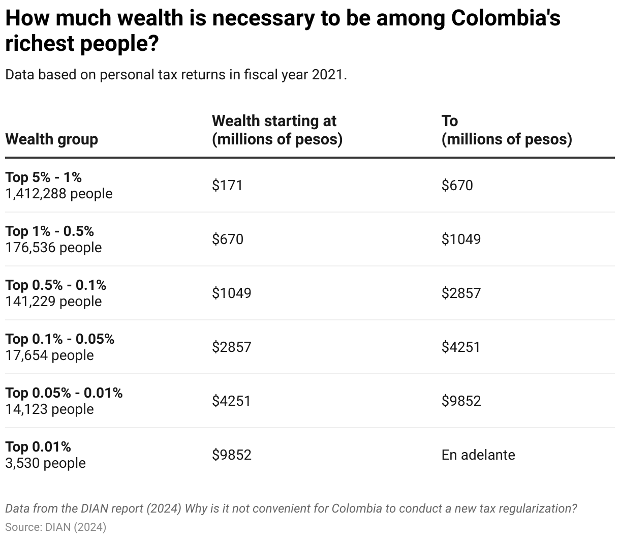 The Commission of Experts on Tax Expenditures/Benefits, convened in 2022 by the administration of former President Iván Duque, reached conclusions that were similar to those found in the Oxfam report. “Regressive tax exemptions for personal income tax frequently result in the wealthiest Colombians paying less in taxes than their poorest compatriots,” the document states. According to the report, the ultra-rich manage to pay less taxes than high-income taxpayers: a person in the top 1% paid the state a smaller share of their earnings than a less wealthy person.
