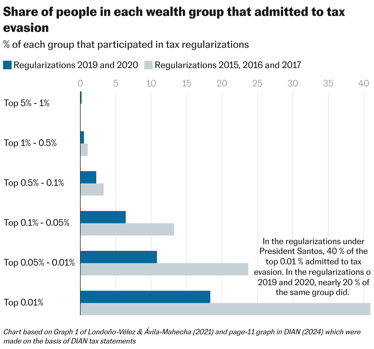 “As wealth increases, the likelihood of having hidden information from the tax authorities about assets or liabilities also increases,” the document states. The research shows that the wealthier the individuals, the more money they had hidden away. “97% of the people who participated in the 2019 amnesty belonged to the 5% of [Colombian] adults with the highest wealth (net worth) that year.” The richest 0.5% of people in the country regularized 91% of all the money declared by individuals during the 2019 and 2020 tax amnesties.
