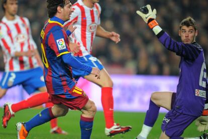 Sánchez Flores brought Forlán into the fray for the second half and Atlético enjoyed a period of ascendancy. Filipe Luis should have scored but found Gerard Piqué's head with Víctor Váldes beaten and the home crowd finally found its voice to admonish Atlético's temerity in keeping the ball for occasionally productive spells. It was not long before the balance of the match was restored though, with David de Gea saving smartly from a rare Messi header as Barcelona once again pressed forward. The Argentinean's third compounded Atlético's woe. Through on goal, Diego Godín and De Gea were unable to prevent Messi from bundling the ball over the line and the Atlético keeper received an accidental boot in the face from David Villa for his efforts.