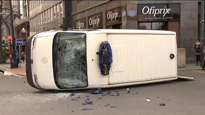 Demonstrations began with two marches, which started out at Sagrado Corazón and Arriaga squares. When demonstrators reached Gran Vía, a group of hooded men infiltrated the march and began setting trash bins on fire and using them as road barricades.