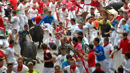 The excitement of the encierros does not depend on whether people get gored, yet the excitement of a spectacle based on the danger posed by the biggest and fiercest fighting bulls that the industry has to offer is somewhat diminished when the race is as fast and clean as today’s: only a few falls, a runner who got knocked down, and a horn briefly coming near the skin of a bold (or disoriented) runner. On Thursday, happily, there were only two people who required medical attention – for light bruising and concussion – according to the first medical report of the day.