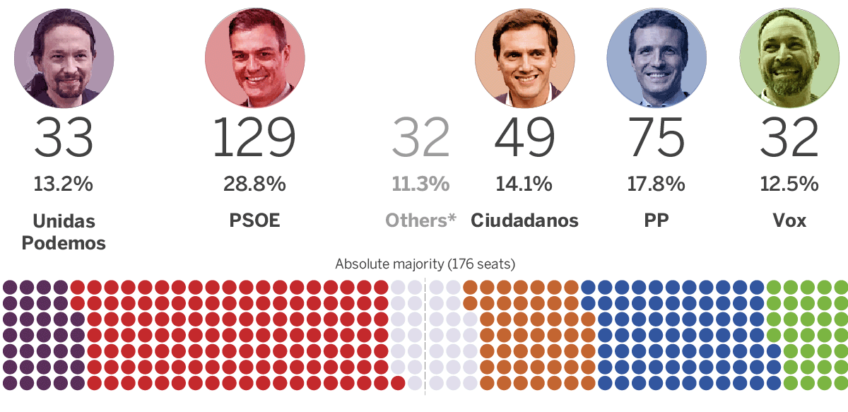 Each candidate is hoping to use the debate to sway undecided voters before polling day on Sunday, April 28. According to the latest survey by 40dB, commissioned by EL PAÍS, 28% of voters remain undecided. The survey shows that the PSOE remains the clear favorite and predicts the party will take 28.8% of the vote and 129 seats in Congress. But this still falls short of the 176 seats needed for an absolute majority, meaning Sánchez will need the support not only of Podemos, but also of regional parties if he is to form a government.