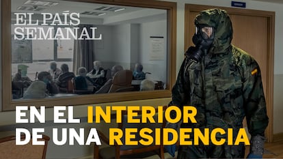 “Come on, Maria, finish your milk and your muffin,” says a nurse to an 80-year-old eating breakfast in her room at the Alcalá de Henares residence where the paratroopers are waiting to disinfect. “The police are going to come and help us.” The senior care facility is a home of smaller homes, with each room holding the treasured memories of the resident as well as their most prized possessions. There are old black and white photos, framed fans, children’s drawings and religious prints. On the sink stands the perfume gifted by the grandchildren at Christmas. One of the rooms looks like a small palace with silver candlesticks and a red velvet armchair, and another looks like the cell of a Carthusian monastery. The resident of this one doesn’t want to go out in the hall. He needs convincing. The care workers at the residence have lifted the mattresses, opened the wardrobes and bathrooms and removed the curtains and carpets. The residents are confined to the dining room on each floor and sit there with their masks on, on separated chairs. All look confused and some look panic-stricken. Most are sad. After a while, they appear to become lost in their own thoughts. One woman, who has been watching the decontamination process through the glass, suddenly claps her hands and cries, “Long live Spain!”
