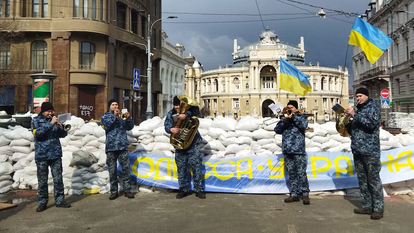 Meanwhile, at the barricade outside Odessa’s famous theater, Grigori Barats, the head of Odessa’s historical-cultural club, is tapping his foot to the beat of the music being played by the navy band. He can’t contain his smile. By his side, a guitarist and an accordionist are playing and singing about “Mother Odessa.” “There are many cities in the world,” says Barats. “But no city is more beautiful than Odessa. I am willing to give my life for her. And if not, let them hang me.”