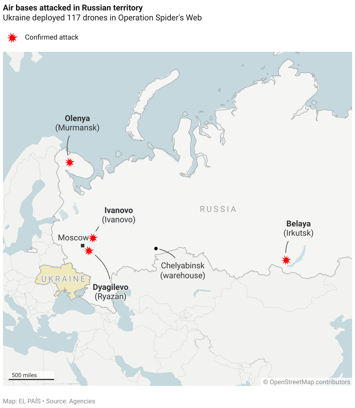 Even if only the 13 confirmed targets were destroyed, the success of the operation, dubbed “Spider’s Web,” would be equally incontestable. Not only because of the damage caused, but also because Ukraine has struck Russia for the first time in Siberia, at the Belaya base, almost 5,000 kilometers (3,100 miles) from its borders.