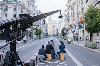 On Pelayo street, in Madrid’s trendy neighborhood of Chueca, the production company left a letter-size sheet of paper stuck to a plastic fence alerting residents to the fact that on the night of June 17 and 18 there would be a film shoot in the area. At 8.30 p.m. on the 18th, there were more than 40 people filling 100 meters of sidewalk as they prepared to start shooting, while the actors, already in makeup and wardrobe, chatted in a circle. Passersby stopped to ask what was going on, then looked up at the giant spotlights hanging from the balconies and figured it out. A group of young tourists crossed the street, dodging the hustle and bustle, while a neighbor looked out over the balcony railing to watch the scene below.