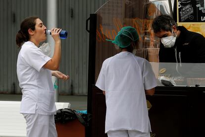 Ana González, a 22-year-old volunteer nurse, does not go home when her shift ends “I stay in case someone gets dizzy and I have to go back in.” According to González, the working hours at Ifema are set by the protective suit: between four and six hours a day with one day off a week: “And that day, we work for free.” With the protective suit on, health workers cannot go in for more than six hours. But many staff who worked last weekend say that after experiencing the conditions on Sunday they may not last a minute longer. “And we can’t allow ourselves to take sick leave,” says one health worker. “The worst is yet to come.”