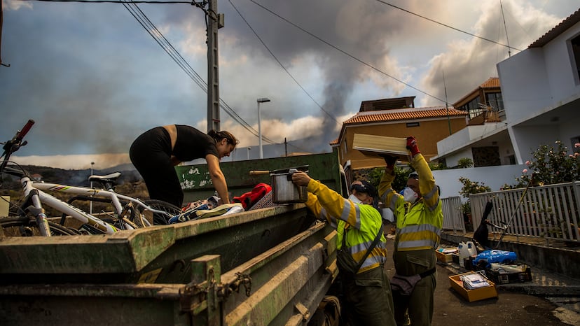 The advance of the mountain of lava is slow but clear to see. It is also terrifying. Further down the hillside, there is the house belonging to Oliver Carmona’s friend. It’s pretty and well-taken care of, and has a swimming pool and flower beds. The owners, their friends and council employees are all rushing to empty it. They are piling everything they can onto a van: a bicycle, a pair of cushions, a ladder, a fridge… Nearby, a young woman who is likely the owner of the house, cries as she closes the trunk of the car, which is packed with possessions. She then enters the house to emerge later with a load of paintings. One of the friends points to one of the vans and says: “All of this to Kity’s house.” Others nearby, under the falling ash, are loading up another small truck: a nightstand, a mattress, a basket with bags of lentils and chickpeas, a bucket filled with clothes…