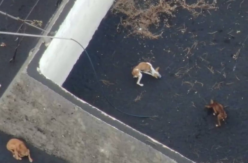 The dogs are trapped inside two water deposits in Todoque, one of the first municipalities to be devastated by the advancing lava streams from the volcano on Cumbre Vieja, which began erupting on September 19. News of their plight emerged last week, and for several days now they have been fed and given water with light drones operated by two local companies.