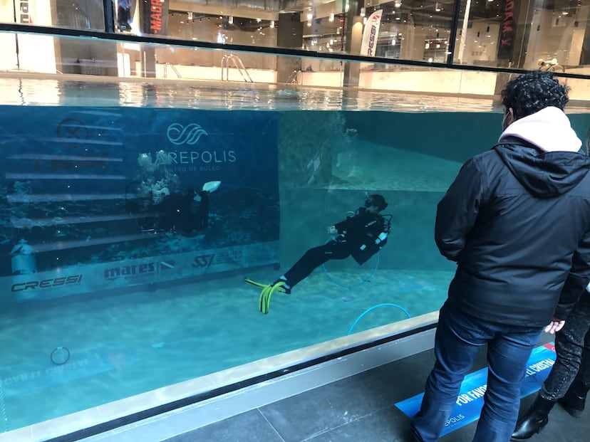 The sounds of sirens and car engines can be heard in the distance. But inside Marepolis, a newly opened diving center in the X-Madrid shopping mall in Alcorcón, time stands still. A type of fish tank, in which divers tumble and glide, welcomes visitors to the center. But the attraction of this 2,000-square-meter site is at the far end of the pool – an enormous 20-meter deep tube for diving experiences far from the sea.