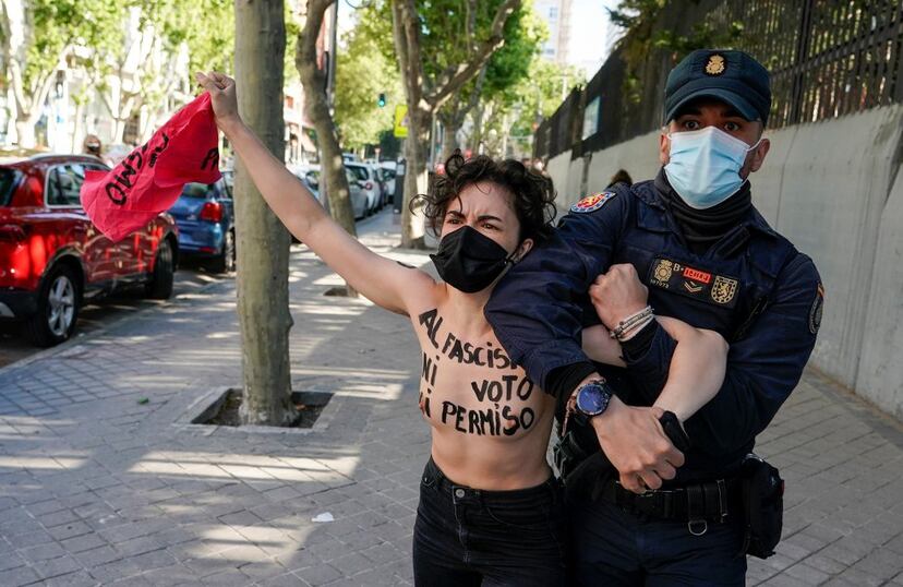 Feminist group Femen staged a topless protest when the far-right Vox party candidate, Rocío Monasterio, went to cast her ballot. There were doubts, meanwhile, about the color of the Popular Party’s voting slips