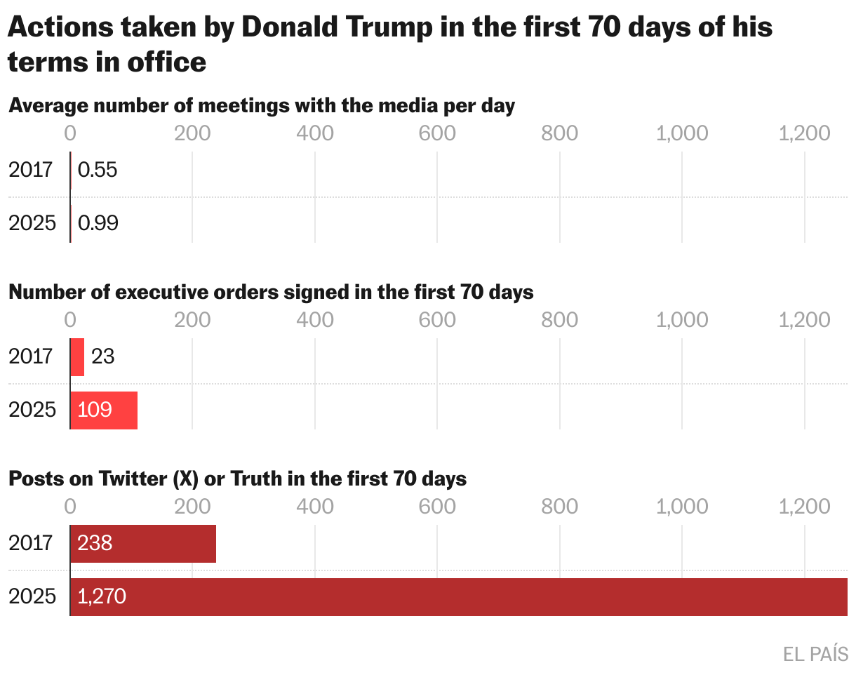 In his first 70 days, Trump has “flooded the zone” more than any other president in U.S. history and more than the presidents of the rest of the world in the same period of time. To top it off, he has an army of influencers who help him multiply his message on social networks.