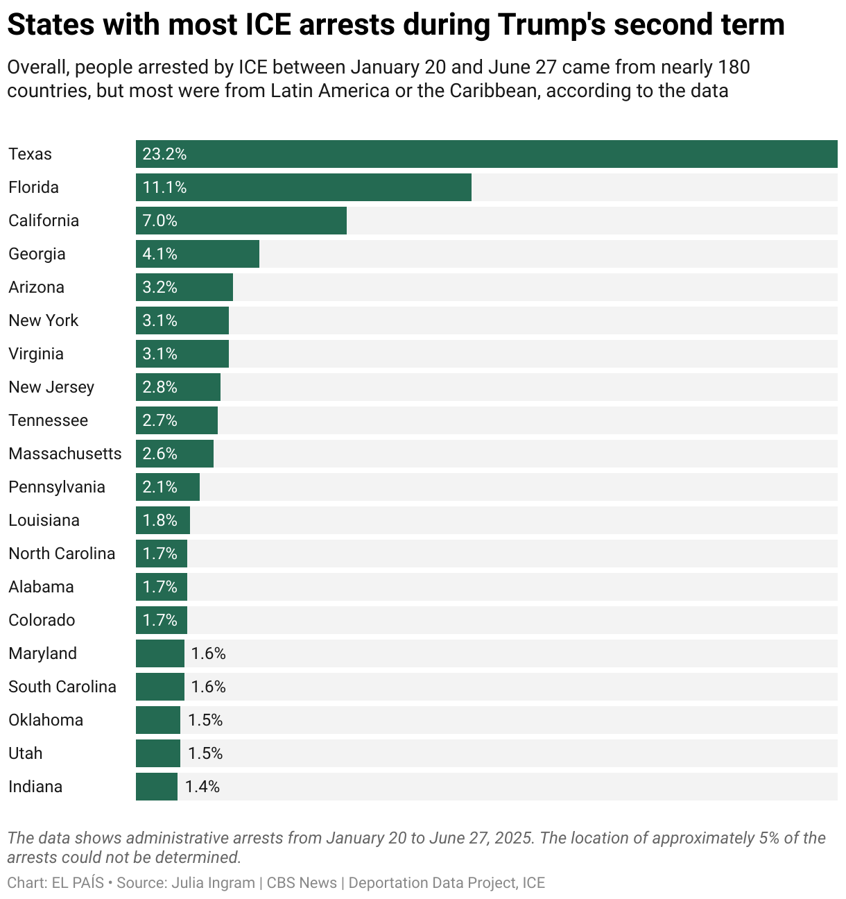 In the first five months of Donald Trump’s second term, specifically between January 20 and June 27, there have been 109,000 immigrant arrests by Immigration and Customs Enforcement (ICE) agents, with the states bordering Mexico (California and Texas), along with Florida, recording the highest number nationwide, according to official figures published by the Deportation Data Project.
